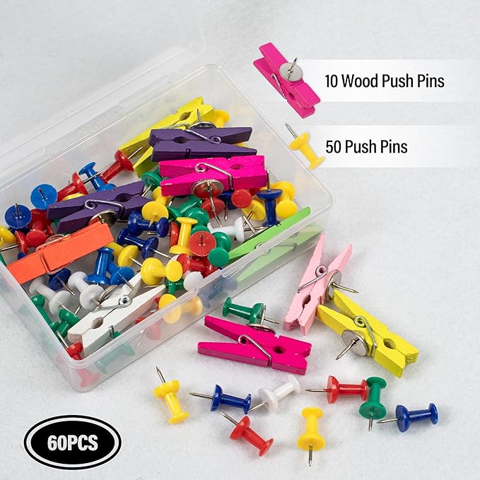 - Corkboard Set: 10 natural wood clips, beautiful and practical, hold more than 30 sheets of office A4 paper; 50 color pins, sturdy and durable, pin important papers and messages to cork boards; 1 plastic box, orderly placement of small parts