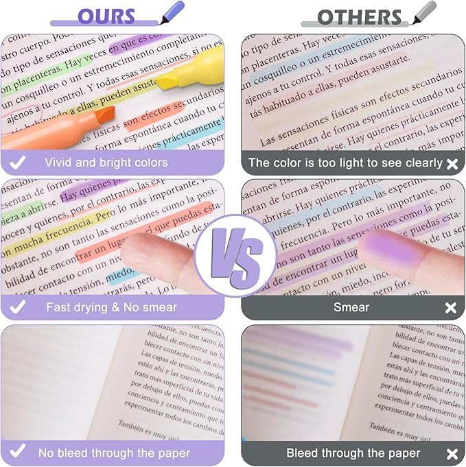- Non-bleed & Quick-Drying: Highlighter markers use quick-drying ink, making highlighted marks clearly visible without worrying about the ink staining your hands and your book. Even if you highlight on one side of the page, the other side is still completely readable, and there's no need to worry about ink bleeding through and affecting the readability of the page.