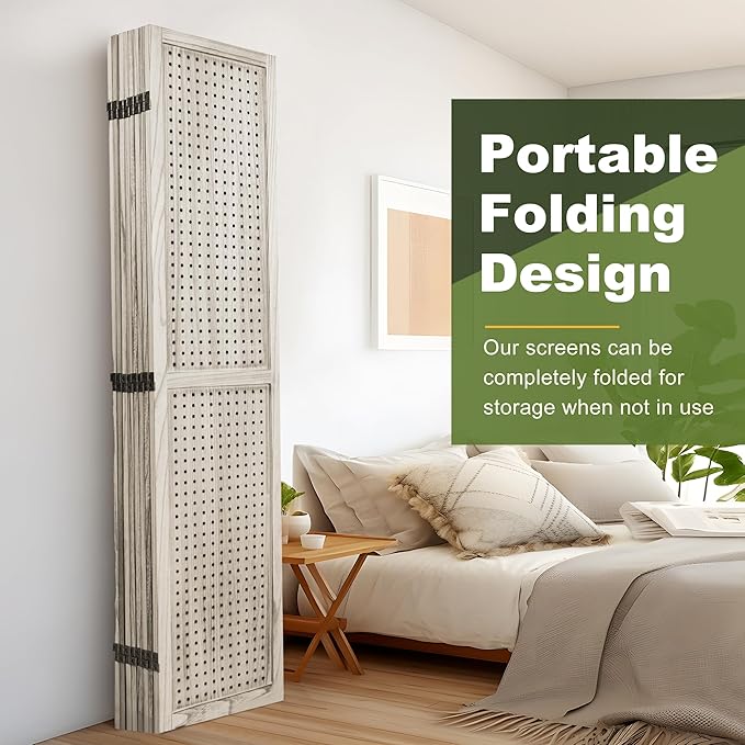 - Versatile Pegboard Panel Design:Our pegboard panel features 0.3-inch diameter holes spaced 1 inch apart, compatible with various peg hooks. This room divider doubles as a decorative folding privacy screen or wall organizer, and serves as a freestanding display panel for trade shows, craft fairs, department stores, and more.
