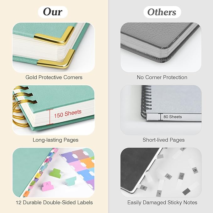 - 【Premium Leather Cover & Strong Binding】Spiral notebook showcases a luxurious leather hard cover, complete with golden corner protectors for extra durability. Its professional design not only looks stylish but is built to last. The strong metal double spiral binding allows for a full 360° lay-flat design, making writing more comfortable and efficient. Whether flipping through or laying the Subject notebook flat, this design guarantees a smooth writing experience.