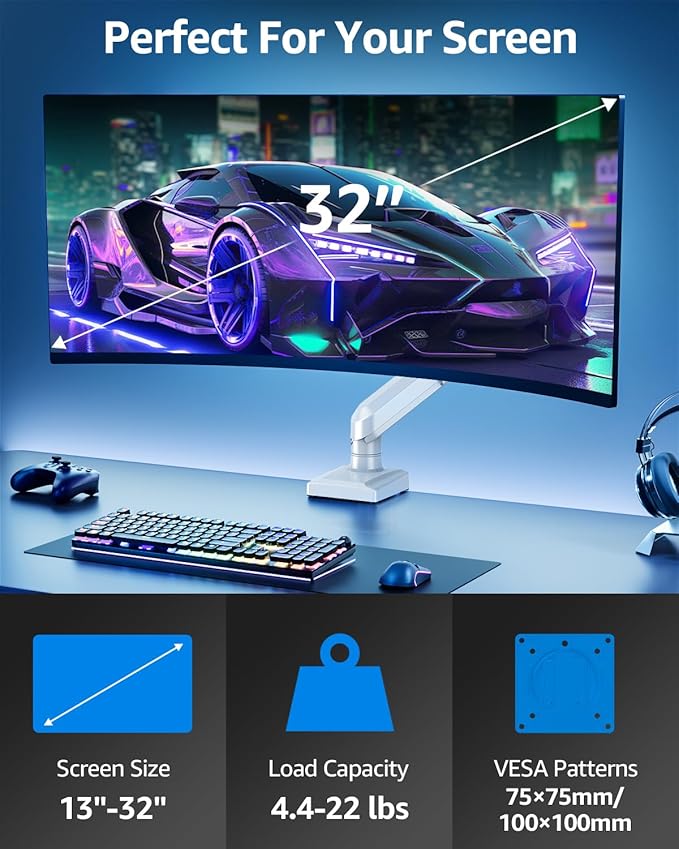 - Universal Single Monitor Arm: The Freelift Pro gas spring monitor arm is designed to most 22 - 32 inch flat or curved monitors, holding 4.4 - 22 lbs screens. With VESA patterns 75x75mm and 100x100mm, compatible with Samsung, ASUS, Acer, LG, HP, AOC, Dell, Sceptre, etc. It is perfect for anyone seeking a sturdy and reliable full motion monitor mount for workspace.