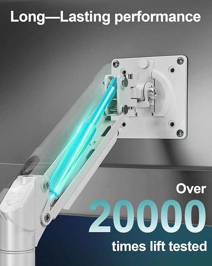 - Strong Support: The computer stand is designed with aluminum arm and a strong gas spring that has undergone 20,000 motion tests to ensure long-lasting performance and provides excellent stability to support monitors from 4.4 to 22 lbs. You can extend the monitor arm out 19.7β³to bring your screen closer or raise it up to 17.3β³above the desk surface for a better viewing position. This dynamic adjustment makes it possible to position your screen closer to eye level for more comfort.