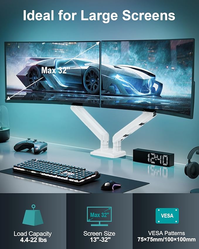 - Universal Monitor Stand: Our dual monitor arm perfectly fits most flat or curved LCD/LED screens ranging from 13" to 32", with a max load capacity of 22 lbs for flat/curved screens, suitable for VESA patterns of 75x75mm & 100x100mm. Compatible with ASUS, Acer, Samsung, LG, AOC, Dell, etc., not limited to 32 30 28 27 25 24 23 22 21 20 19 17 inch screen, but not compatible with 1000R/1500R/1800R curved screens.