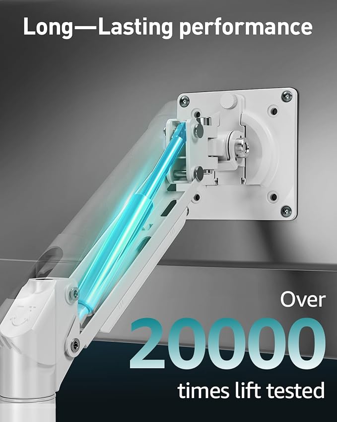 - Strong Support: The single monitor mount is designed with aluminum arm and a strong gas spring that has undergone 20,000 motion tests to ensure long-lasting performance and provides excellent stability to support monitors from 4.4 to 22 lbs. You can extend the monitor arm out 19.7β³ to bring your screen closer or raise it up to 17.3β³ above the desk surface for a better viewing position. This dynamic adjustment makes it possible to position your screen closer to eye level for more comfort.