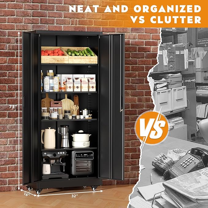 Greenvelly 74" Metal Storage Cabinet with Wheels, Lockable Rolling Metal Garage Cabinets with 2 Doors and 4 Adjustable Shelves, Rolling Tool Cabinet for Garage, Home Office, School