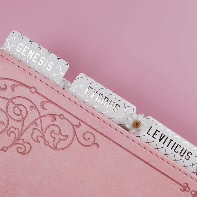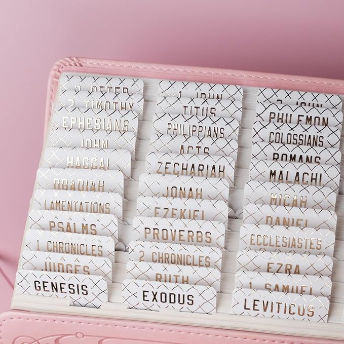 - Large Print, Easy to Read & Easy to Install:Silky velvet touch laminate,carefully designed pretty Bible accessories . The peel-and-stick Bible index tabs are self adhesive, simply align them with the provided guide or place them creatively.