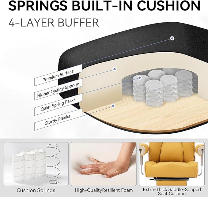 - LUXURIOUS AND UNIQUE OFFICE CHAIR The yellow office chair combines elegant design with a unique look, adding a stylish and vibrant touch to your office or home. The tall and tall office chair features a high-back design paired with a thick, saddle seat cushion. make it more than just an comfy office chair—it’s a statement piece that elevates your space, showcasing Youth and Confidence
