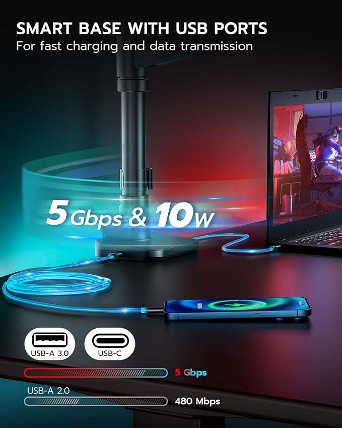 - 【Convenient USB Ports】The dual monitor stand with enhanced USB functionality allows simultaneous charging of two devices. Integrated USB-C and USB-A ports (5V/2A) enable timely charging for your phone, watch, tablet, laptop, or headphones when battery levels are low, ensuring long-lasting peace of mind during use.