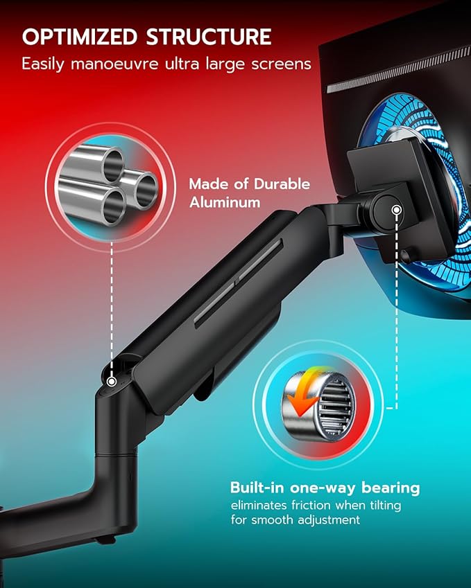 - 【Flexible Adjustment】The dual monitor arms adjust to a maximum height of 28.4 inches, with arms extending 21.8 inches. Featuring a stable premium gas spring and an upgraded head structure, it allows for -50° to +20° tilt, ±90° rotation, and 360° swivel. This monitor dual mount accommodates various screen layouts, optimizing your desktop space and providing an exceptional comfort experience for gaming or viewing.