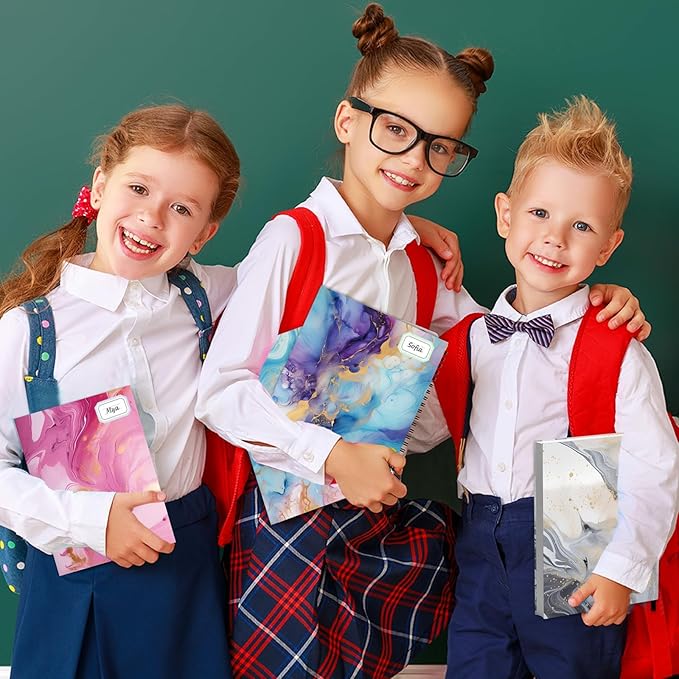 - Book cover kit: This pack comes with 8pcs stretchable book covers in different marble print styles, along with a sheet of name tag labels. These jumbo book covers fit books measuring 9x11 inches and can stretch up to 10x12.5 inches.