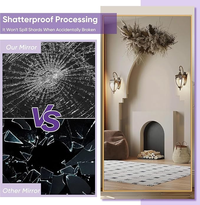 - High Quality and Safety Guarantee: The floor mirror is made of 3mm HD nano glass which provides high definition reflection. The back features an anti-explosion film, even if it's accidentally damaged, shards won't scatter everywhere, safe for surrounding children or pets