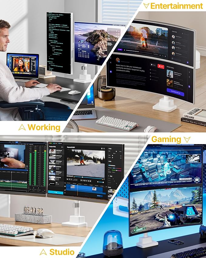 - 【Universal Compatibility & Stability】Engineered for ultimate adaptability, this dual monitor arm supports 17" to 57" curved screens with VESA patterns from 75x75mm to 100x100mm. Compatible with major brands like Samsung and LG, its heavy-duty aluminum construction ensures rock-solid stability and supports up to 59.4 lbs