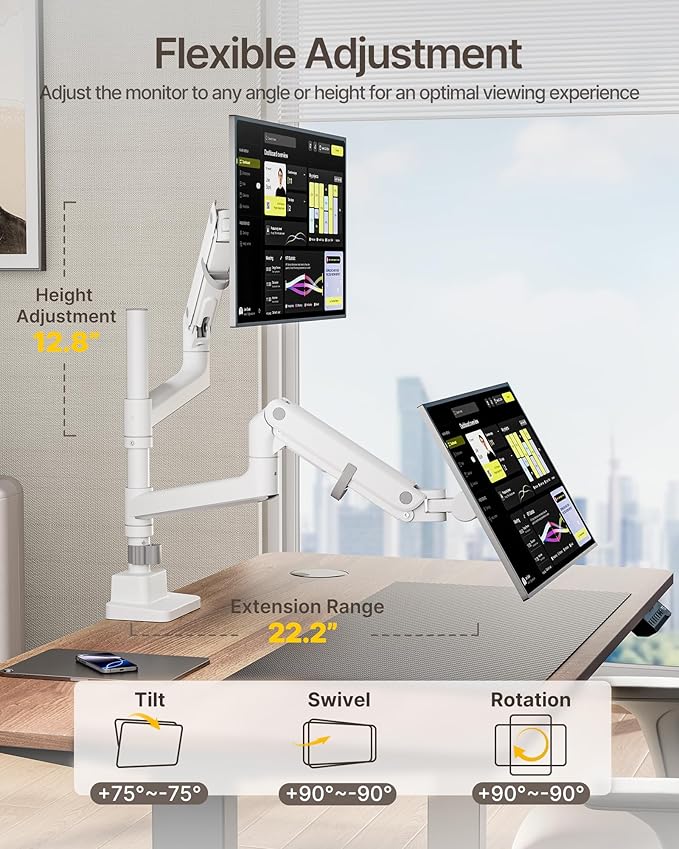 - 【Ergonomic Precision & Flexibility】Tilt (-75° to +75°), swivel (±90°), and 180° screen rotation allow effortless customization of your viewing angles, reducing neck. 19.2" height pole adjustment and side-by-side or vertical stacking for dual-monitor setups. The monitor arm height range up to 29.4", and extends up to 22.2" to help you achieve the perfect viewing angle