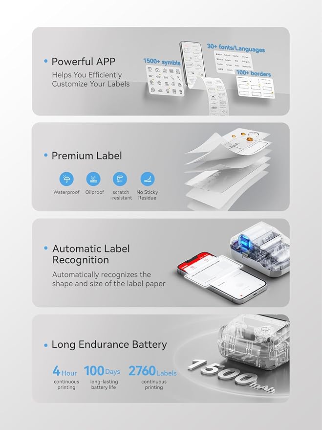 - 【Portable and Rechargeable】 The thermal label printer weighs 293g and can slide into your pocket, easy to be carried anywhere. Built-in durable and rechargeable 1500mAh battery standby time up to 100 days on a single charge.