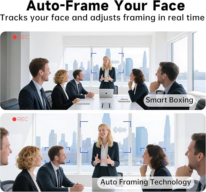 - 【Auto Framing for Smart Viewing】Featuring 10x electronic pan-tilt-zoom and intelligent Auto Framing, the webcam automatically tracks and centers faces, making it ideal for group meetings—no need to manually adjust the frame when participants move or join the call.