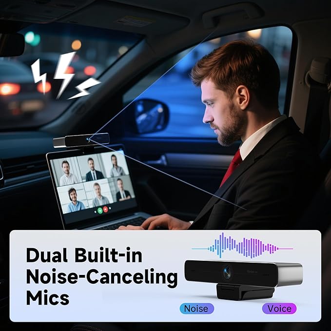 - 【Dual Built-in Noise-Canceling Mics PC Camera】Equipped with two built-in microphones, it captures clear audio up to 6 meters away. Advanced noise suppression technology filters out background sounds, ensuring crystal-clear voice quality for meetings, live streaming, or broadcasts, making it the ideal web camera for desktop computer.