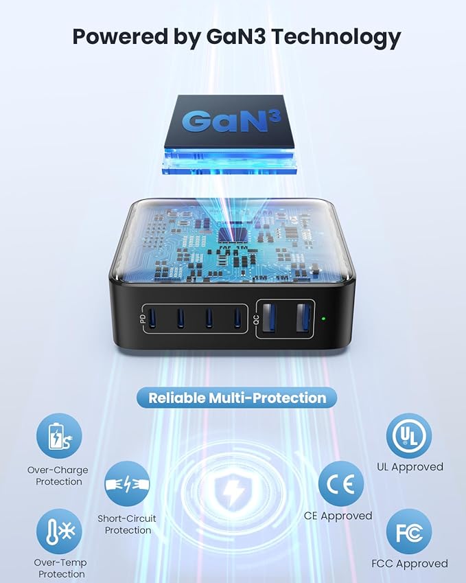 - 【Universal Compatibility with up to 3000+ Devices】This GaN charger is able to charge can fast charge 1 laptop, 2 phones/tablets and 3 others at once. All ports support (quick charge) agreement, it’s compatible for MacBook Pro/Air, iPhone 16, iPhone 15/14 or previous models, iPad Pro/Air, Samsung Galaxy or previous models, Google Pixel, Dell XPS, Switch, and more, covering a whole family needs and save money&space.
