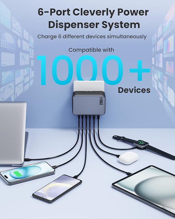 - 【Newly 6-in-1 200W USB Charger】 With the 6Ports usb c charger to experience the convenience and superior charging speed for powering 6 devices at once with charging station's total 200W output. Most importantly it can simultaneously quick charge laptop, phone, tablet and other gadgets all with one block. A must have usable product when you go home/working/traveling and there are lesser charging slots available but multiple devices that need to be charged.