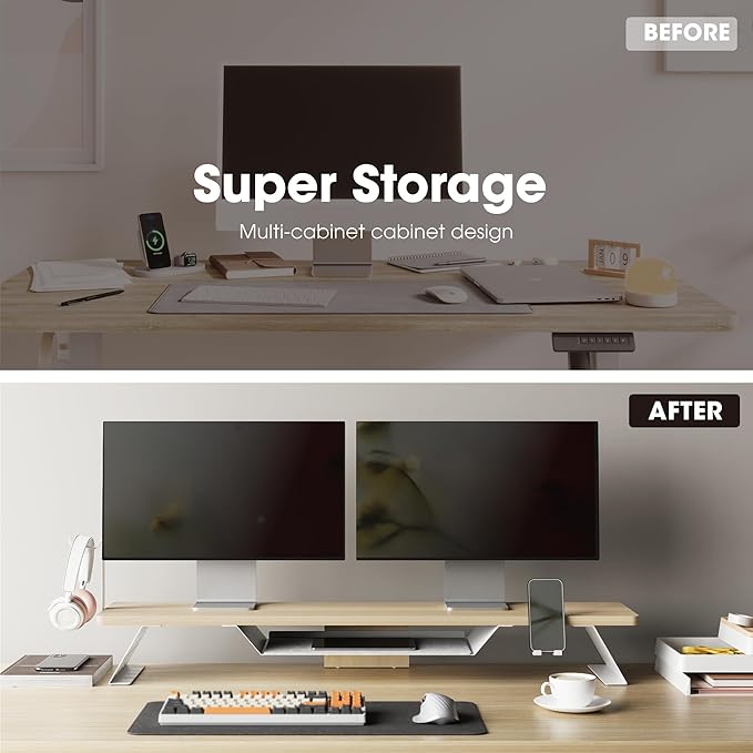 - 【Ergonomic & Adjustable】Monitor shelf raises your monitor or laptop by 5.4 inches to the perfect eye level, reducing neck and shoulder strain. Pre-drilled holes computer stand let you position headphone stand and phone holder left or right according to your habits, balancing efficiency and health.