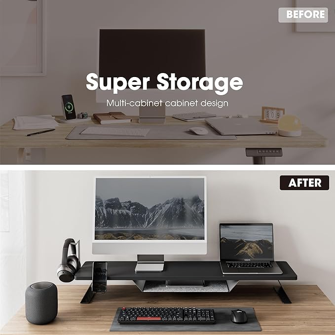 - 【All-in-One Workstation】Fenge desk shelf innovatively combines dual monitor stand with phone stand and headphone holder, meets the needs of multi-device office work. The second shelf (16.5”L×2.1”H ) stores office accessories, maximizes space for a clean, efficient workstation.