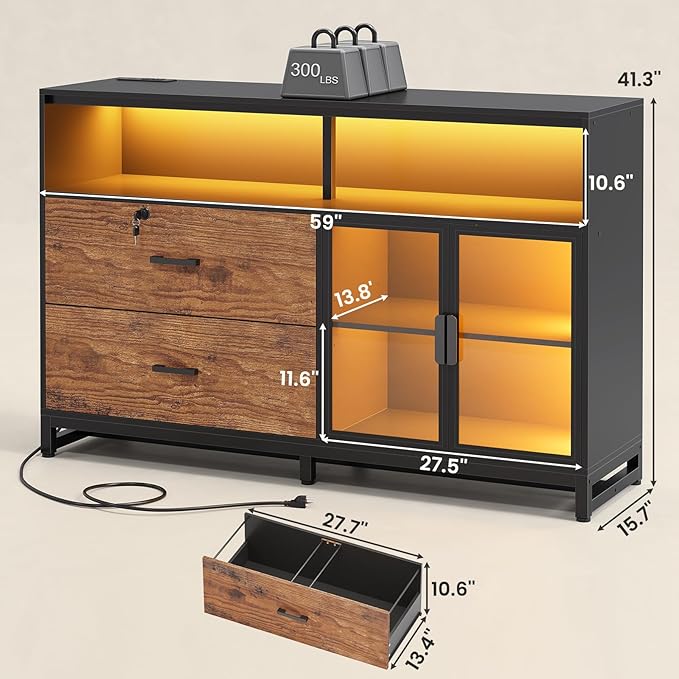 - πγWhat Can You Get?γ The file cabinet has 2 file drawers with 1 lock for Legal, Letter, A4 sizes standard file, power strip for charging 4 devices at the same time, spacious desktop(59"L) large enough for printers and scanners, 4 storage shelves, a pair of acrylic cabinet door for protecte documents and LED light. Filing cabinet that can be combined with any computer desk to form an L-shaped office area.