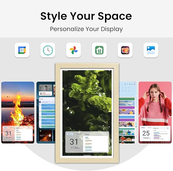 - HD DISPLAY WITH WOODEN FRAME: The touchscreen with Incell + AG Tech offers stunning clarity and glare-free viewing. Designed for flexible placement, it supports wall mounting (mounting accessories included) or can be used with a compatible stand (sold separately). Easily switch between portrait and landscape modes. The adjustable sleep/wake function ensures energy efficiency while the elegant wooden frame blends seamlessly into any home décor.