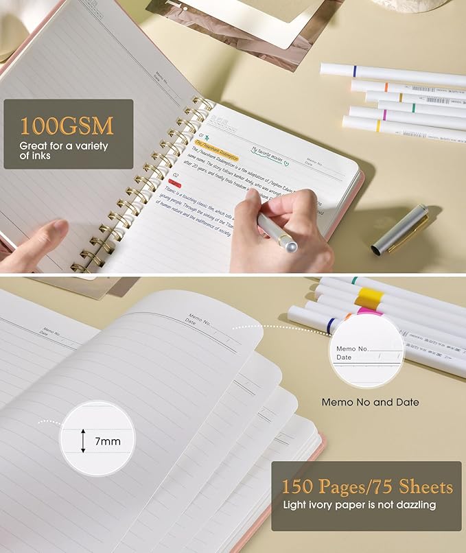 - 【A5 Journal with 100 GSM High-Quality Paper】 Crafted from 100 GSM thick ink-friendly paper, our notebook prevents ink bleed-through and ghosting. It accommodates various pens, including ballpoint, gel, and fountain pens. Standard 7mm-space Classic College Grid Notebook with “Memo Number” and “Date” headings on each page to help you keep track of dates. A5 size 5.75" x 8.38", perfect size for carrying around or put into your bag or purse.