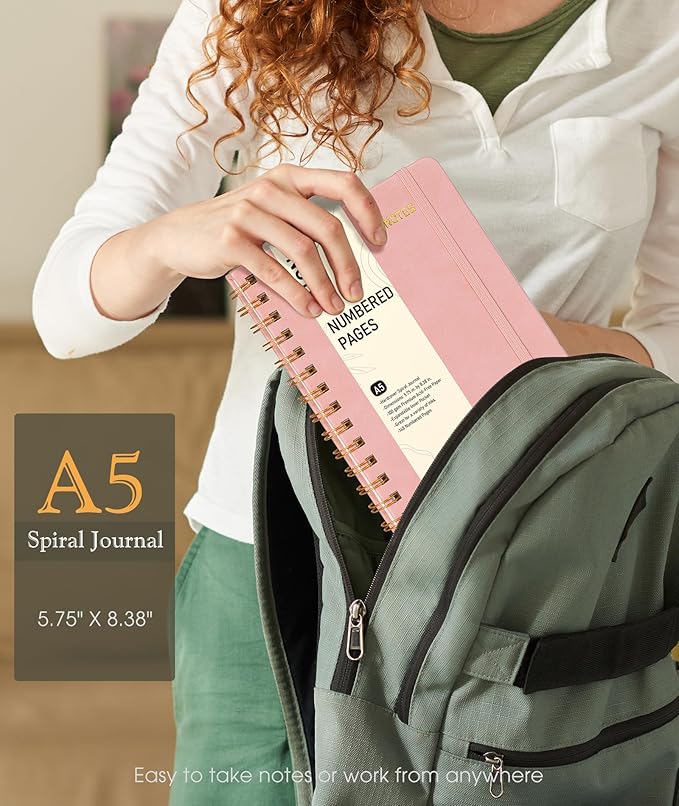 Lined Spiral Journal Notebook for Women, A5 Hardcover Notebooks for Work, 150 Numbered Pages Pink Notebook, 100GSM College Ruled Journals for Writing, Note Taking, 5.75" x 8.38"