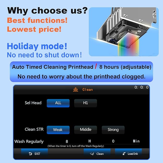 - ❤️❤️❤️Holiday Mode :The First automatic printhead timing cleaning system(free to adjust the timing),Say goodbye to print head blockages! ❤️❤️❤️Two Year Ink Supply : With your printer purchase, you’ll receive a two-year supply of ink— 5 bottles (250ml each) and 500g of powder! Get a new set every two months, and you only need to cover the shipping,Only within the US.