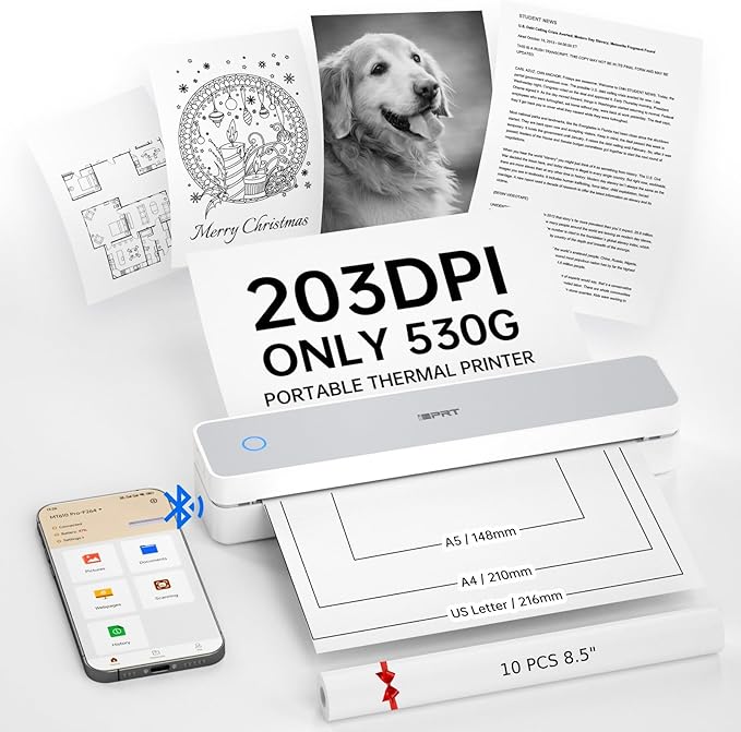 - Inkless Printing Technology: This advanced bluetooth printer utilizes thermal technology, no ink cartridges needed! With a resolution of 203 DPI, clear printing and high speedβcompleting a US Letter/A4 page in just 4-6 seconds. ( Note: Supports black-and-white printing exclusively and requires thermal paper. )
