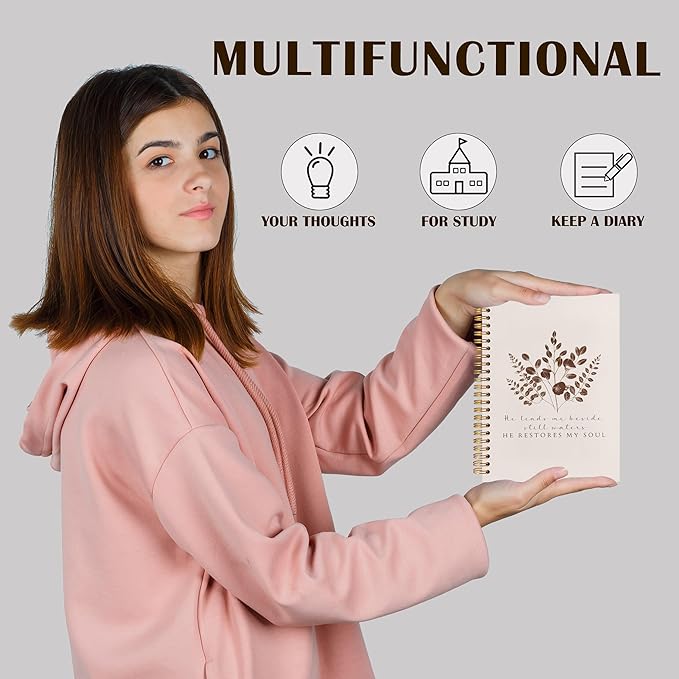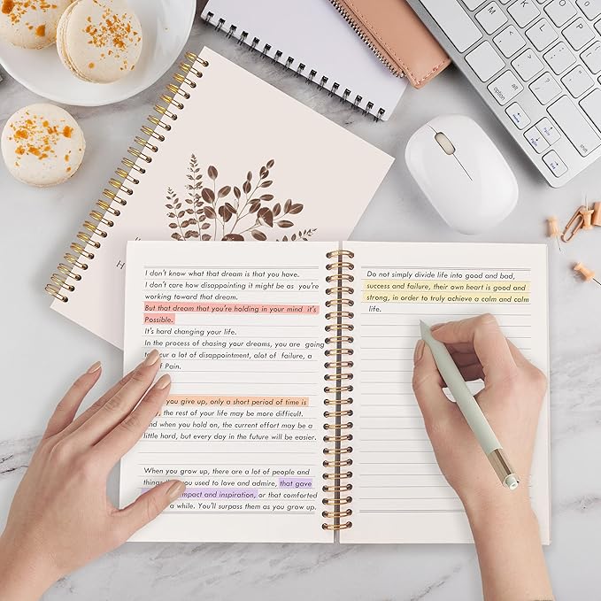 • Size and Construction: Measures approximately 5.5 x 8.3 inches. Comes with a hardcover and spiral binding, making it easy to open flat and write comfortably.