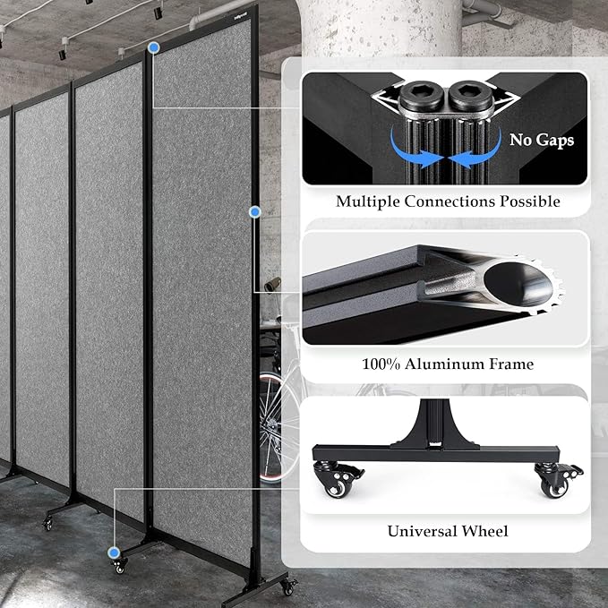 Upgrade Version Room Partition and Divider, Freestanding Rolling Dividers with Wheels,Office Privacy Screen Divider Wall,Classroom Felt Dividers,12'2"L* 6'7"H,6 Panel,Light Grey