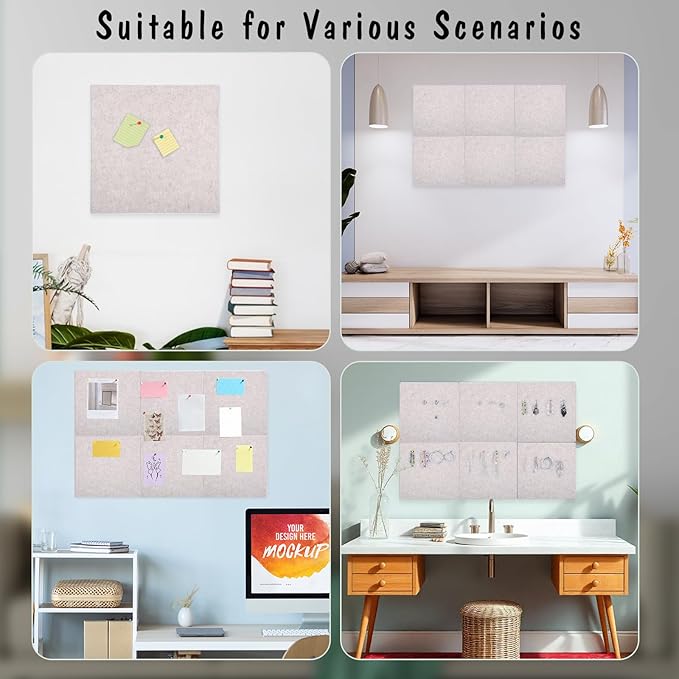 - 【Package Includes】You will receive 6 pack felt wall tiles and 1 box colorful thumbtacks (about 30pcs). The size of each felt wall tile is 11.8" x 11.8" and the thickness is about 0.35". You can splice them into the desired shape and size according to your needs, such as 36" x 24", 12" x 72", etc.