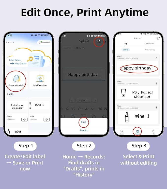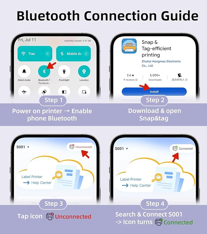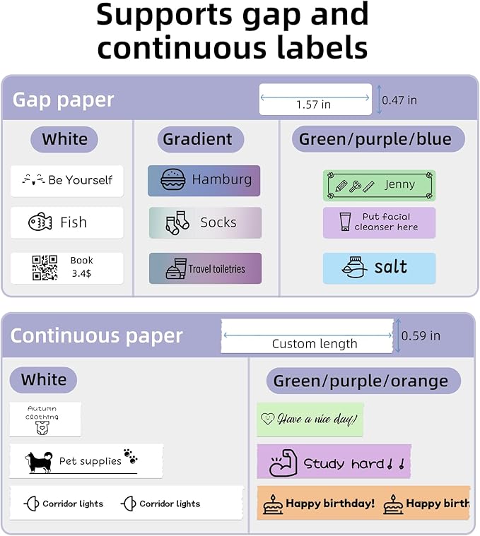 - Multiple Creative Functions: The Snap & Tag app for this Bluetooth label maker provides various features and templates, easily create label stickers with text, QR codes, barcodes, materials, images, time, and borders; Customize label lengths with continuous tape, or use fixed-size labels for batch printing, featuring a built-in cutter for simple label cutting