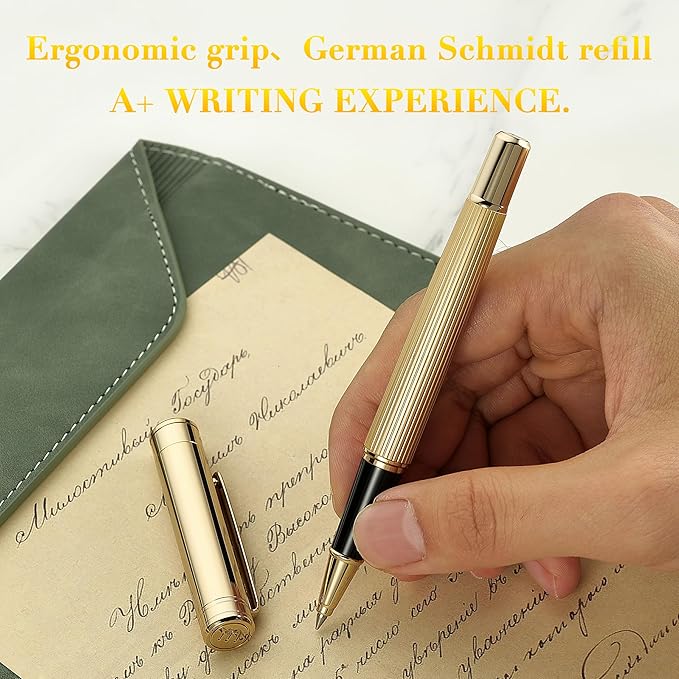 BEILUNER Lighthouse Series Rollerball Pen, 24K Gold Finish Pen Body, Exquisite Vertical Lines, Schneider 850 Refill, Nice Pen Gift Set for Men & Women, Office, Executive and Fancy Designer Pens (Gold)