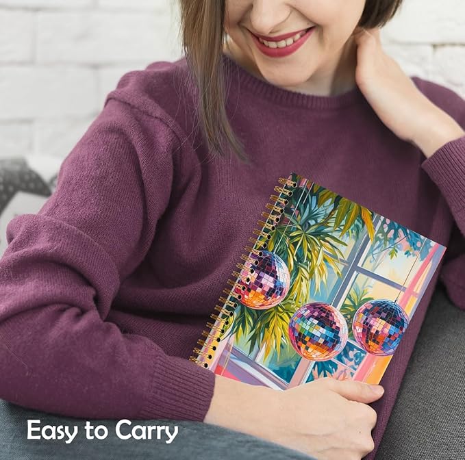 Vibrant Trendy Disco Balls Notebook, Funky Mirror Ball Journal, Maximalist Tropical Botanical Disco Journal, Modern Aesthetic Hardcover Spiral Notebook, 5.5x8.3 Inch