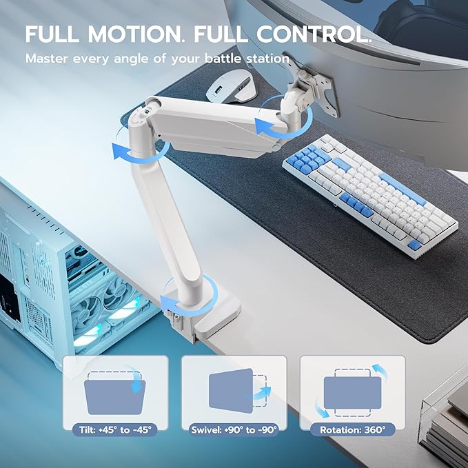 - Ergonomic Comfort & Full Motion - A monitor placed too high, too low, or at the wrong distance can lead to neck and shoulder pain over time. Thatβs why a monitor arm is more than just an accessoryβitβs a game changer for your comfort and health. Unlike standard monitor stands, this fully adjustable arm gives you the flexibility to position your screen exactly where you need it for proper ergonomics.Enjoy effortless adjustments with a wide range of motion: tilt from +45Β° to -45Β°, swivel from +90Β° to -90Β°, and full 360Β° screen rotation. Whether you're working, gaming, or multitasking, youβll always have the perfect viewing angle