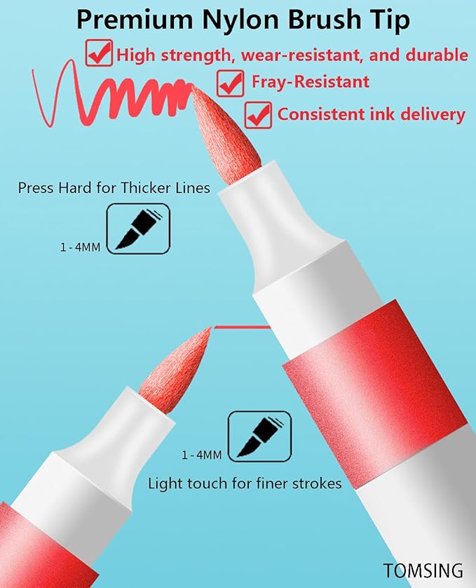- 【High-Quality Brush tip】 The durable fiber brush nip resists breaking under strong pressure, won’t fray with repeated friction, and maintains its shape even during long creative sessions. Whether drawing bold outlines or delicate gradients with a light touch, the tip remains stable, preventing issues like "wearing down" or "flattening."