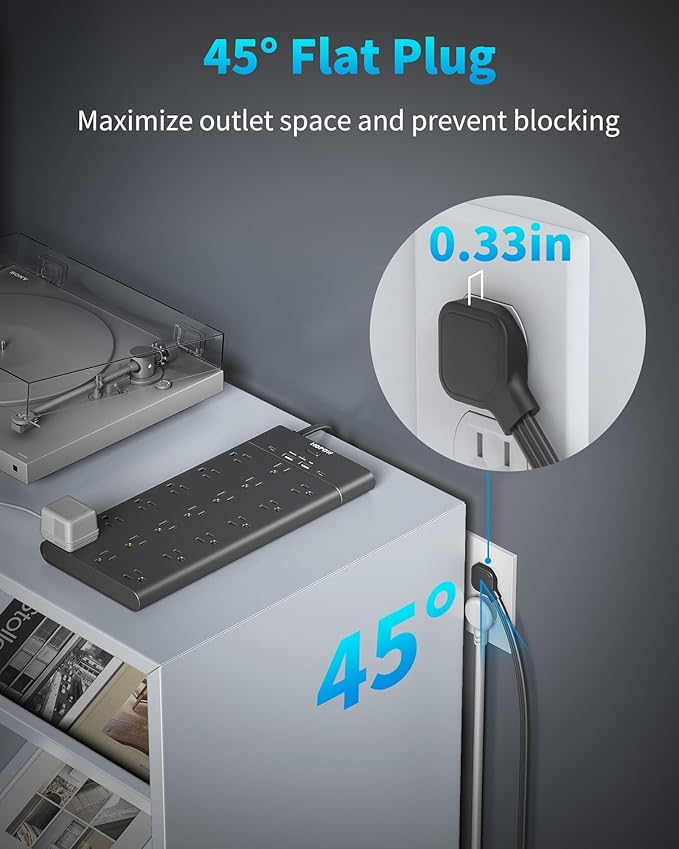 - 【Mountable Design & Flat Plug】This extension cord with multiple outlets includes T-shaped mounting holes for easy installation on walls, preventing cord tangling. Our ultra-thin flat plug design (only 0.33 inches) allows the extension cord to easily fit behind furniture. The 45-degree right-angle design prevents it from blocking other plugs.