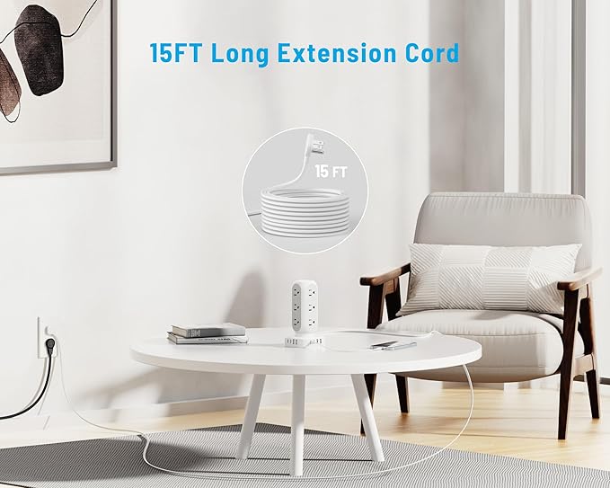 - 【Ultra Thin Flat Plug & 15FT Extension Cord】- With only 0.27 inch ultra thin plug design, the flat plug power strip can easily close to the wall and hide behind sofa or other furniture, 45° right angle plug design prevents bottom plug blocking. 15FT extension cord is made of pure copper, which has better current carrying capacity (15A). The cord is long enough to solve your electricity problem.