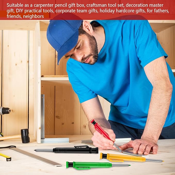 - Package Included: 8-pack mechanical carpenter pencils with 48 pcs 2.8 mm replacement cores, black, yellow, red and green color combination, black pen: black writing has high contrast on dark wood surface and is easy to identify; It can be applied for preliminary cutting lines, rough positioning, and emphasis on marking joints or load-bearing parts that need special attention; The red color is eye-catching and can be applied for warning marks, temporary corrections, and soft wood markings