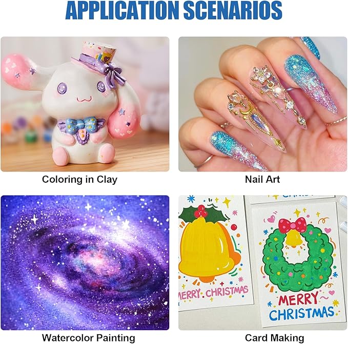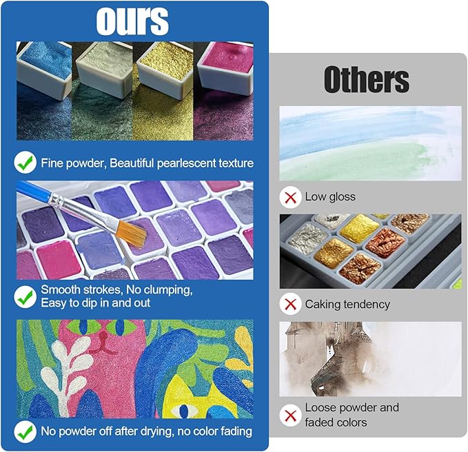 - 【Smooth Strokes, No Powder Off】Our watercolors paint set are extremely durability. Glitter watercolor remain highly stable, drying without crumbling or fading, making the watercolor painting shine forever. The fine powder texture makes the strokes of the pearl paint smooth and resists clumping