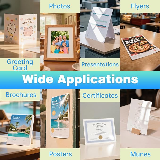 • USED FOR: Unfold greeting cards, Photos, Photo Albums, Arts, Menu Printing, Calendars, Brochures, Flyers, Posters,Christmas Cards ,Wedding Cards, etc value packed for your business and home use