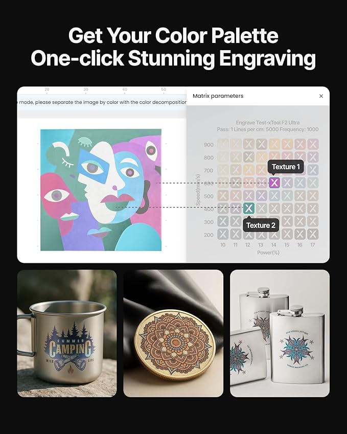 - 100+ Consistent Colors Engraving on Metal: This 60W MOPA laser engraving machine delivers over 100 vibrant and consistent colors on metals, thanks to its precisely calibrated structure and premium optical system. Our pre-set color files help you to engrave a color matrix in one click, making it easy to find the right settings for any color. No more repetitive testing, saving you time!