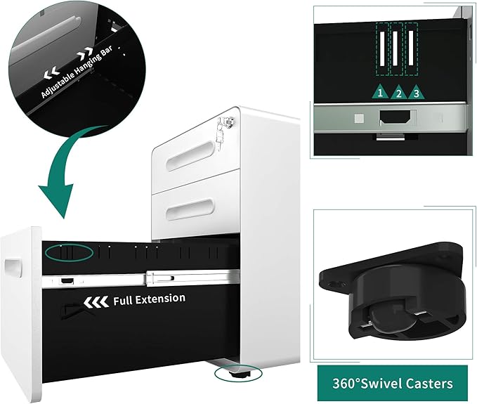 - Convenient & Free-range Mobility: Rolling file cabinet (no need to install except casters) with rounded corners and inset handles, You only need to install 4 x 360Β° swivel casters. Easy and safe to move. Warm tip: If the items placed are too heavy, it is recommended to reduce the weight of the items before moving them